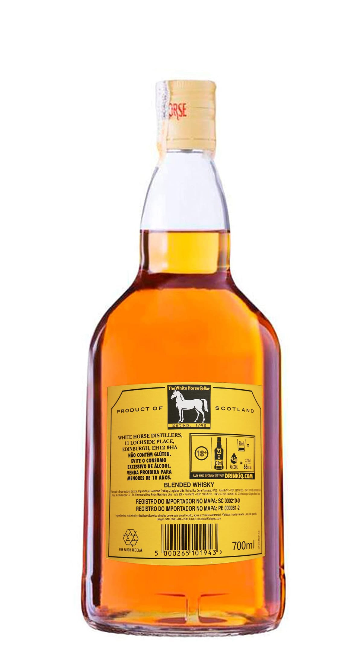 PaÃs - Escócia Região - Várias Marca - White Horse Tipo - Blended Scotch Whisky Idade - NAS (No Age Statement - Sem idade definida) Graduação alcoólica - 40«V Composição - Destilado alcoólico de malte envelhecido, destilado alcoólico de cereais envelhecido, água, corante caramelo Litragem - 700ml R$ 99,90 Em estoque (3x de R$ 33,30)