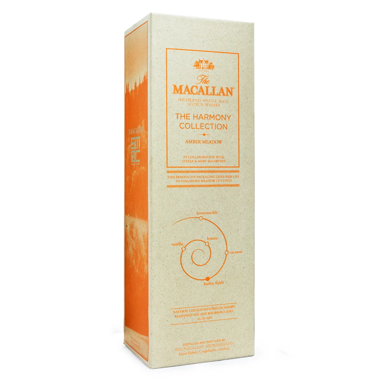 Nomeado “Amber Meadow” em homenagem aos campos com coloração âmbar da fazenda, o whisky é apresentado em uma embalagem inovadora feita a partir de restos de pasto aparado, refletindo a beleza das pradarias escocesas. Criado a partir de uma mistura de barris de carvalho ex-Jerez e ex-bourbon, o Macallan Amber Meadow traz uma cor evocativa das noites de verão e um aroma envolvente com notas de laranja, limão, baunilha, coco e campos de cevada maduros.